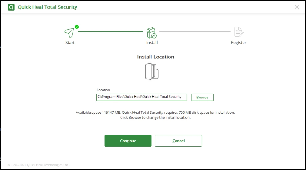 Step 8: Select location if you wish to install Quick Heal Software in any other location or keep the default location & Click on Continue