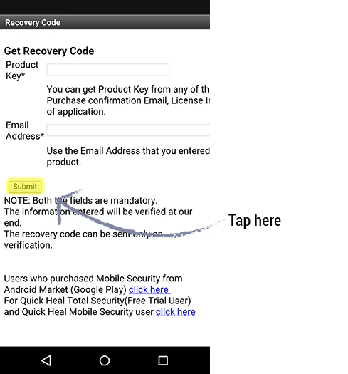 Step 3: The Recovery Code screen is displayed. Enter valid details (product key and registered email address). Tap on Submit.